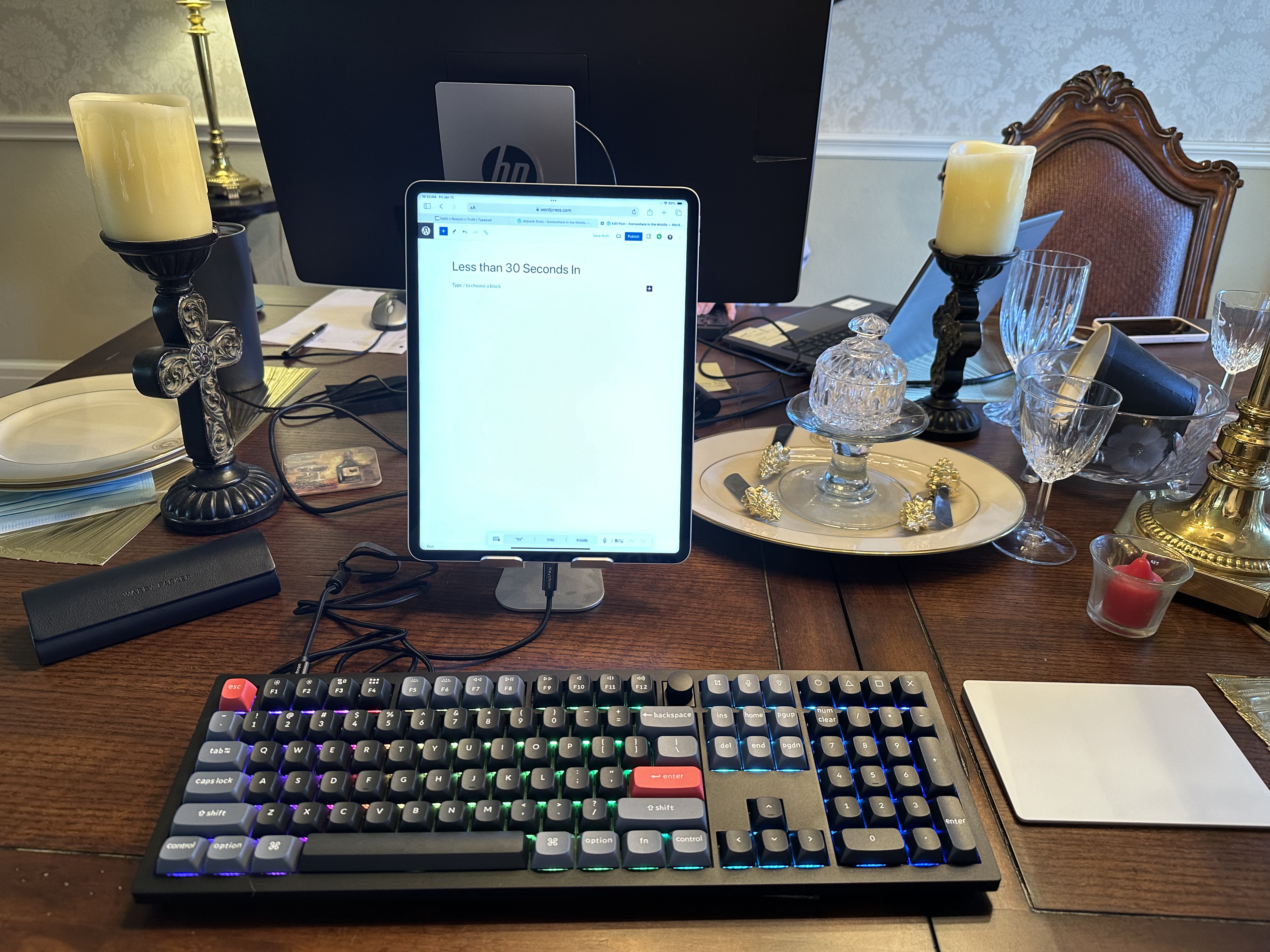 Then, just as suddenly, a voice from somewhere in the immediate vicinity spoke. “What is THAT? Oh, no, we are not doing that. Are you serious?” My beautiful, loving wife, the back of whose monitor you see in the image at the top of this post, is not a fan of the sound. Within roughly 30 seconds of pulling the unexpectedly heavy (making it all the more satisfying) keyboard out of its styrofoam-cushioned box and plugging it into the USB-C port on the iPad Pro 12.9 M1 where it was automatically and instantly recognized and enabled, I experienced the full reaction gamut of mechanical keyboard aficionados everywhere: “YES! I have FOUND the thing that has been been missing from my life, and all is now complete!” coupled with an immediate and severe rejection of the soothing clickety-clack on offer from the Brown switches housed within.