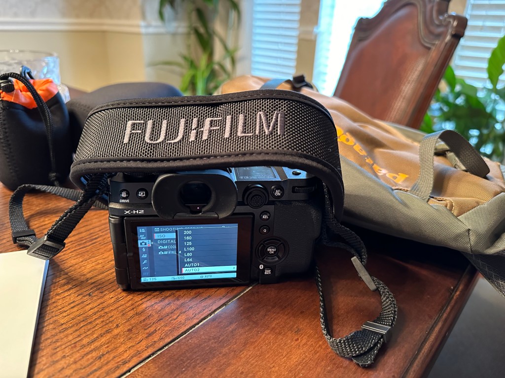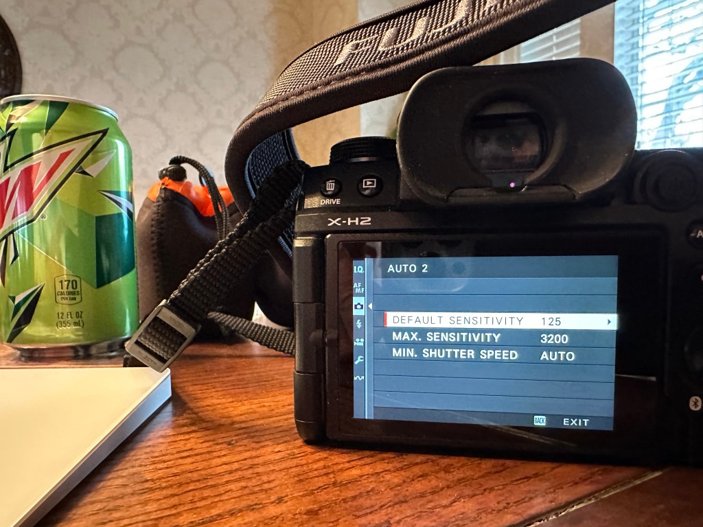 It is always on (pretty sure you can turn it off in settings, but I love that is always on and it doesn’t affect the battery to an extent that affects my usage), and it is actually easier to check everything at an effortless glance than studying the teeny tiny numbers on top of the dials of the X-T-whatever (I have the X-T20 and the X-T3). And if I want to change any of them, then yes, the dials take less thought, but it is quite easy on the X-H2 as well. You can either roll the front or rear dial, depending on which setting you are changing, or just quickly hit the Menu and do something like this: go to the Camera icon, scroll down to ISO (I often have ISO set automatically) and change it there to whatever you like – OR, you can set the ISO to Auto1, Auto2, or Auto3, where you can have presets (for instance, Default Sensitivity of 125, Max . Sensitivity of 3200, and Min. Shutter Speed of Auto). You can set those 3 Autos to whatever you like, then quickly select whichever one suits your current purpose.